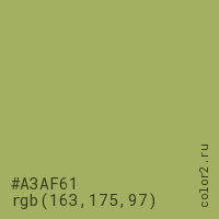 Цвет #A3AF61 в цветовой модели RGB обозначается тремя октетами (163, 175, 97) в десятичном формате и #A3AF61 в шестнадцатиричном (hex) формате, которые являются интенсивностью красного 163 (hex A3), интенсивность зелёного 175 (hex AF) и интенсивность синего 97 (hex 61).