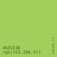 Цвет #A3CE5B в цветовой модели RGB обозначается тремя октетами (163, 206, 91) в десятичном формате и #A3CE5B в шестнадцатиричном (hex) формате, которые являются интенсивностью красного 163 (hex A3), интенсивность зелёного 206 (hex CE) и интенсивность синего 91 (hex 5B).