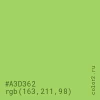 Цвет #A3D362 в цветовой модели RGB обозначается тремя октетами (163, 211, 98) в десятичном формате и #A3D362 в шестнадцатиричном (hex) формате, которые являются интенсивностью красного 163 (hex A3), интенсивность зелёного 211 (hex D3) и интенсивность синего 98 (hex 62).