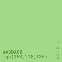 Цвет #A3DA88 в цветовой модели RGB обозначается тремя октетами (163, 218, 136) в десятичном формате и #A3DA88 в шестнадцатиричном (hex) формате, которые являются интенсивностью красного 163 (hex A3), интенсивность зелёного 218 (hex DA) и интенсивность синего 136 (hex 88).