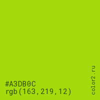 Цвет #A3DB0C в цветовой модели RGB обозначается тремя октетами (163, 219, 12) в десятичном формате и #A3DB0C в шестнадцатиричном (hex) формате, которые являются интенсивностью красного 163 (hex A3), интенсивность зелёного 219 (hex DB) и интенсивность синего 12 (hex 0C).