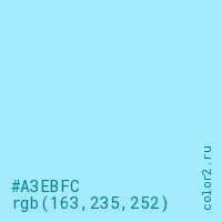 Цвет #A3EBFC в цветовой модели RGB обозначается тремя октетами (163, 235, 252) в десятичном формате и #A3EBFC в шестнадцатиричном (hex) формате, которые являются интенсивностью красного 163 (hex A3), интенсивность зелёного 235 (hex EB) и интенсивность синего 252 (hex FC).