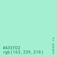Цвет #A3EFD2 в цветовой модели RGB обозначается тремя октетами (163, 239, 210) в десятичном формате и #A3EFD2 в шестнадцатиричном (hex) формате, которые являются интенсивностью красного 163 (hex A3), интенсивность зелёного 239 (hex EF) и интенсивность синего 210 (hex D2).