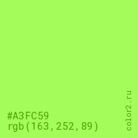 Цвет #A3FC59 в цветовой модели RGB обозначается тремя октетами (163, 252, 89) в десятичном формате и #A3FC59 в шестнадцатиричном (hex) формате, которые являются интенсивностью красного 163 (hex A3), интенсивность зелёного 252 (hex FC) и интенсивность синего 89 (hex 59).