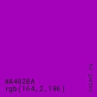 Цвет #A402BA в цветовой модели RGB обозначается тремя октетами (164, 2, 186) в десятичном формате и #A402BA в шестнадцатиричном (hex) формате, которые являются интенсивностью красного 164 (hex A4), интенсивность зелёного 2 (hex 02) и интенсивность синего 186 (hex BA).