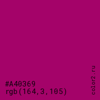 Цвет #A40369 в цветовой модели RGB обозначается тремя октетами (164, 3, 105) в десятичном формате и #A40369 в шестнадцатиричном (hex) формате, которые являются интенсивностью красного 164 (hex A4), интенсивность зелёного 3 (hex 03) и интенсивность синего 105 (hex 69).