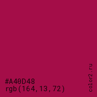 Цвет #A40D48 в цветовой модели RGB обозначается тремя октетами (164, 13, 72) в десятичном формате и #A40D48 в шестнадцатиричном (hex) формате, которые являются интенсивностью красного 164 (hex A4), интенсивность зелёного 13 (hex 0D) и интенсивность синего 72 (hex 48).