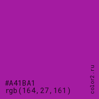 Цвет #A41BA1 в цветовой модели RGB обозначается тремя октетами (164, 27, 161) в десятичном формате и #A41BA1 в шестнадцатиричном (hex) формате, которые являются интенсивностью красного 164 (hex A4), интенсивность зелёного 27 (hex 1B) и интенсивность синего 161 (hex A1).