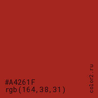 Цвет #A4261F в цветовой модели RGB обозначается тремя октетами (164, 38, 31) в десятичном формате и #A4261F в шестнадцатиричном (hex) формате, которые являются интенсивностью красного 164 (hex A4), интенсивность зелёного 38 (hex 26) и интенсивность синего 31 (hex 1F).
