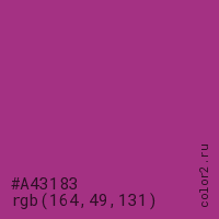 Цвет #A43183 в цветовой модели RGB обозначается тремя октетами (164, 49, 131) в десятичном формате и #A43183 в шестнадцатиричном (hex) формате, которые являются интенсивностью красного 164 (hex A4), интенсивность зелёного 49 (hex 31) и интенсивность синего 131 (hex 83).