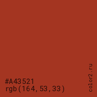 Цвет #A43521 в цветовой модели RGB обозначается тремя октетами (164, 53, 33) в десятичном формате и #A43521 в шестнадцатиричном (hex) формате, которые являются интенсивностью красного 164 (hex A4), интенсивность зелёного 53 (hex 35) и интенсивность синего 33 (hex 21).