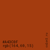 Цвет #A43C0F в цветовой модели RGB обозначается тремя октетами (164, 60, 15) в десятичном формате и #A43C0F в шестнадцатиричном (hex) формате, которые являются интенсивностью красного 164 (hex A4), интенсивность зелёного 60 (hex 3C) и интенсивность синего 15 (hex 0F).