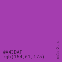 Цвет #A43DAF в цветовой модели RGB обозначается тремя октетами (164, 61, 175) в десятичном формате и #A43DAF в шестнадцатиричном (hex) формате, которые являются интенсивностью красного 164 (hex A4), интенсивность зелёного 61 (hex 3D) и интенсивность синего 175 (hex AF).