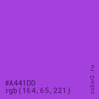 Цвет #A441DD в цветовой модели RGB обозначается тремя октетами (164, 65, 221) в десятичном формате и #A441DD в шестнадцатиричном (hex) формате, которые являются интенсивностью красного 164 (hex A4), интенсивность зелёного 65 (hex 41) и интенсивность синего 221 (hex DD).