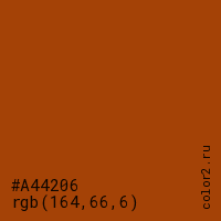 Цвет #A44206 в цветовой модели RGB обозначается тремя октетами (164, 66, 6) в десятичном формате и #A44206 в шестнадцатиричном (hex) формате, которые являются интенсивностью красного 164 (hex A4), интенсивность зелёного 66 (hex 42) и интенсивность синего 6 (hex 06).