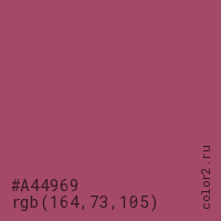 Цвет #A44969 в цветовой модели RGB обозначается тремя октетами (164, 73, 105) в десятичном формате и #A44969 в шестнадцатиричном (hex) формате, которые являются интенсивностью красного 164 (hex A4), интенсивность зелёного 73 (hex 49) и интенсивность синего 105 (hex 69).