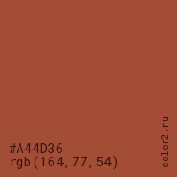 Цвет #A44D36 в цветовой модели RGB обозначается тремя октетами (164, 77, 54) в десятичном формате и #A44D36 в шестнадцатиричном (hex) формате, которые являются интенсивностью красного 164 (hex A4), интенсивность зелёного 77 (hex 4D) и интенсивность синего 54 (hex 36).