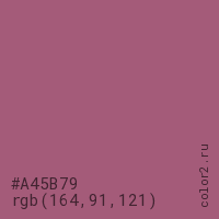 Цвет #A45B79 в цветовой модели RGB обозначается тремя октетами (164, 91, 121) в десятичном формате и #A45B79 в шестнадцатиричном (hex) формате, которые являются интенсивностью красного 164 (hex A4), интенсивность зелёного 91 (hex 5B) и интенсивность синего 121 (hex 79).
