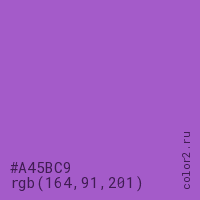 Цвет #A45BC9 в цветовой модели RGB обозначается тремя октетами (164, 91, 201) в десятичном формате и #A45BC9 в шестнадцатиричном (hex) формате, которые являются интенсивностью красного 164 (hex A4), интенсивность зелёного 91 (hex 5B) и интенсивность синего 201 (hex C9).
