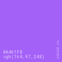 Цвет #A461F8 в цветовой модели RGB обозначается тремя октетами (164, 97, 248) в десятичном формате и #A461F8 в шестнадцатиричном (hex) формате, которые являются интенсивностью красного 164 (hex A4), интенсивность зелёного 97 (hex 61) и интенсивность синего 248 (hex F8).