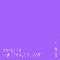 Цвет #A461FA в цветовой модели RGB обозначается тремя октетами (164, 97, 250) в десятичном формате и #A461FA в шестнадцатиричном (hex) формате, которые являются интенсивностью красного 164 (hex A4), интенсивность зелёного 97 (hex 61) и интенсивность синего 250 (hex FA).