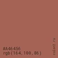 Цвет #A46456 в цветовой модели RGB обозначается тремя октетами (164, 100, 86) в десятичном формате и #A46456 в шестнадцатиричном (hex) формате, которые являются интенсивностью красного 164 (hex A4), интенсивность зелёного 100 (hex 64) и интенсивность синего 86 (hex 56).