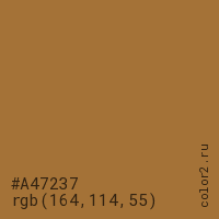 Цвет #A47237 в цветовой модели RGB обозначается тремя октетами (164, 114, 55) в десятичном формате и #A47237 в шестнадцатиричном (hex) формате, которые являются интенсивностью красного 164 (hex A4), интенсивность зелёного 114 (hex 72) и интенсивность синего 55 (hex 37).