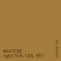 Цвет #A47C3B в цветовой модели RGB обозначается тремя октетами (164, 124, 59) в десятичном формате и #A47C3B в шестнадцатиричном (hex) формате, которые являются интенсивностью красного 164 (hex A4), интенсивность зелёного 124 (hex 7C) и интенсивность синего 59 (hex 3B).