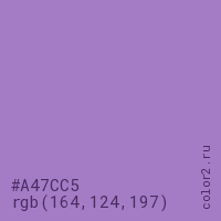 Цвет #A47CC5 в цветовой модели RGB обозначается тремя октетами (164, 124, 197) в десятичном формате и #A47CC5 в шестнадцатиричном (hex) формате, которые являются интенсивностью красного 164 (hex A4), интенсивность зелёного 124 (hex 7C) и интенсивность синего 197 (hex C5).