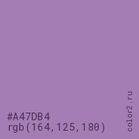 Цвет #A47DB4 в цветовой модели RGB обозначается тремя октетами (164, 125, 180) в десятичном формате и #A47DB4 в шестнадцатиричном (hex) формате, которые являются интенсивностью красного 164 (hex A4), интенсивность зелёного 125 (hex 7D) и интенсивность синего 180 (hex B4).