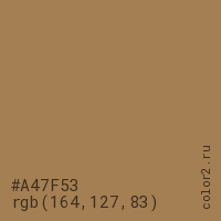 Цвет #A47F53 в цветовой модели RGB обозначается тремя октетами (164, 127, 83) в десятичном формате и #A47F53 в шестнадцатиричном (hex) формате, которые являются интенсивностью красного 164 (hex A4), интенсивность зелёного 127 (hex 7F) и интенсивность синего 83 (hex 53).