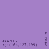 Цвет #A47FC7 в цветовой модели RGB обозначается тремя октетами (164, 127, 199) в десятичном формате и #A47FC7 в шестнадцатиричном (hex) формате, которые являются интенсивностью красного 164 (hex A4), интенсивность зелёного 127 (hex 7F) и интенсивность синего 199 (hex C7).