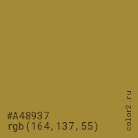 Цвет #A48937 в цветовой модели RGB обозначается тремя октетами (164, 137, 55) в десятичном формате и #A48937 в шестнадцатиричном (hex) формате, которые являются интенсивностью красного 164 (hex A4), интенсивность зелёного 137 (hex 89) и интенсивность синего 55 (hex 37).