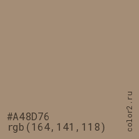 Цвет #A48D76 в цветовой модели RGB обозначается тремя октетами (164, 141, 118) в десятичном формате и #A48D76 в шестнадцатиричном (hex) формате, которые являются интенсивностью красного 164 (hex A4), интенсивность зелёного 141 (hex 8D) и интенсивность синего 118 (hex 76).