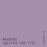 Цвет #A48FAD в цветовой модели RGB обозначается тремя октетами (164, 143, 173) в десятичном формате и #A48FAD в шестнадцатиричном (hex) формате, которые являются интенсивностью красного 164 (hex A4), интенсивность зелёного 143 (hex 8F) и интенсивность синего 173 (hex AD).