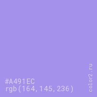 Цвет #A491EC в цветовой модели RGB обозначается тремя октетами (164, 145, 236) в десятичном формате и #A491EC в шестнадцатиричном (hex) формате, которые являются интенсивностью красного 164 (hex A4), интенсивность зелёного 145 (hex 91) и интенсивность синего 236 (hex EC).