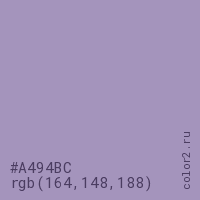 Цвет #A494BC в цветовой модели RGB обозначается тремя октетами (164, 148, 188) в десятичном формате и #A494BC в шестнадцатиричном (hex) формате, которые являются интенсивностью красного 164 (hex A4), интенсивность зелёного 148 (hex 94) и интенсивность синего 188 (hex BC).