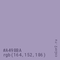 Цвет #A498BA в цветовой модели RGB обозначается тремя октетами (164, 152, 186) в десятичном формате и #A498BA в шестнадцатиричном (hex) формате, которые являются интенсивностью красного 164 (hex A4), интенсивность зелёного 152 (hex 98) и интенсивность синего 186 (hex BA).