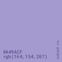 Цвет #A49ACF в цветовой модели RGB обозначается тремя октетами (164, 154, 207) в десятичном формате и #A49ACF в шестнадцатиричном (hex) формате, которые являются интенсивностью красного 164 (hex A4), интенсивность зелёного 154 (hex 9A) и интенсивность синего 207 (hex CF).