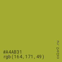 Цвет #A4AB31 в цветовой модели RGB обозначается тремя октетами (164, 171, 49) в десятичном формате и #A4AB31 в шестнадцатиричном (hex) формате, которые являются интенсивностью красного 164 (hex A4), интенсивность зелёного 171 (hex AB) и интенсивность синего 49 (hex 31).