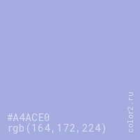 Цвет #A4ACE0 в цветовой модели RGB обозначается тремя октетами (164, 172, 224) в десятичном формате и #A4ACE0 в шестнадцатиричном (hex) формате, которые являются интенсивностью красного 164 (hex A4), интенсивность зелёного 172 (hex AC) и интенсивность синего 224 (hex E0).