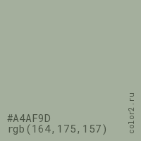 Цвет #A4AF9D в цветовой модели RGB обозначается тремя октетами (164, 175, 157) в десятичном формате и #A4AF9D в шестнадцатиричном (hex) формате, которые являются интенсивностью красного 164 (hex A4), интенсивность зелёного 175 (hex AF) и интенсивность синего 157 (hex 9D).