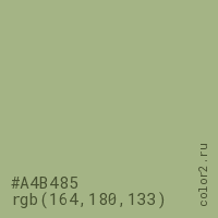 Цвет #A4B485 в цветовой модели RGB обозначается тремя октетами (164, 180, 133) в десятичном формате и #A4B485 в шестнадцатиричном (hex) формате, которые являются интенсивностью красного 164 (hex A4), интенсивность зелёного 180 (hex B4) и интенсивность синего 133 (hex 85).