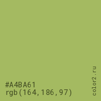 Цвет #A4BA61 в цветовой модели RGB обозначается тремя октетами (164, 186, 97) в десятичном формате и #A4BA61 в шестнадцатиричном (hex) формате, которые являются интенсивностью красного 164 (hex A4), интенсивность зелёного 186 (hex BA) и интенсивность синего 97 (hex 61).