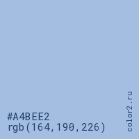 Цвет #A4BEE2 в цветовой модели RGB обозначается тремя октетами (164, 190, 226) в десятичном формате и #A4BEE2 в шестнадцатиричном (hex) формате, которые являются интенсивностью красного 164 (hex A4), интенсивность зелёного 190 (hex BE) и интенсивность синего 226 (hex E2).