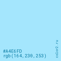 Цвет #A4E6FD в цветовой модели RGB обозначается тремя октетами (164, 230, 253) в десятичном формате и #A4E6FD в шестнадцатиричном (hex) формате, которые являются интенсивностью красного 164 (hex A4), интенсивность зелёного 230 (hex E6) и интенсивность синего 253 (hex FD).