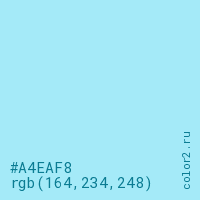 Цвет #A4EAF8 в цветовой модели RGB обозначается тремя октетами (164, 234, 248) в десятичном формате и #A4EAF8 в шестнадцатиричном (hex) формате, которые являются интенсивностью красного 164 (hex A4), интенсивность зелёного 234 (hex EA) и интенсивность синего 248 (hex F8).