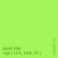 Цвет #A4F45B в цветовой модели RGB обозначается тремя октетами (164, 244, 91) в десятичном формате и #A4F45B в шестнадцатиричном (hex) формате, которые являются интенсивностью красного 164 (hex A4), интенсивность зелёного 244 (hex F4) и интенсивность синего 91 (hex 5B).