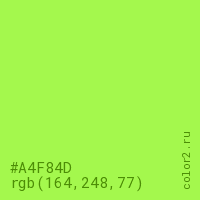 Цвет #A4F84D в цветовой модели RGB обозначается тремя октетами (164, 248, 77) в десятичном формате и #A4F84D в шестнадцатиричном (hex) формате, которые являются интенсивностью красного 164 (hex A4), интенсивность зелёного 248 (hex F8) и интенсивность синего 77 (hex 4D).