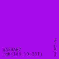 Цвет #A50AE7 в цветовой модели RGB обозначается тремя октетами (165, 10, 231) в десятичном формате и #A50AE7 в шестнадцатиричном (hex) формате, которые являются интенсивностью красного 165 (hex A5), интенсивность зелёного 10 (hex 0A) и интенсивность синего 231 (hex E7).
